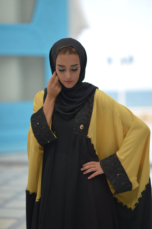 Robe Humeyrah– Élégance Noir et Or avec Châle Assorti"